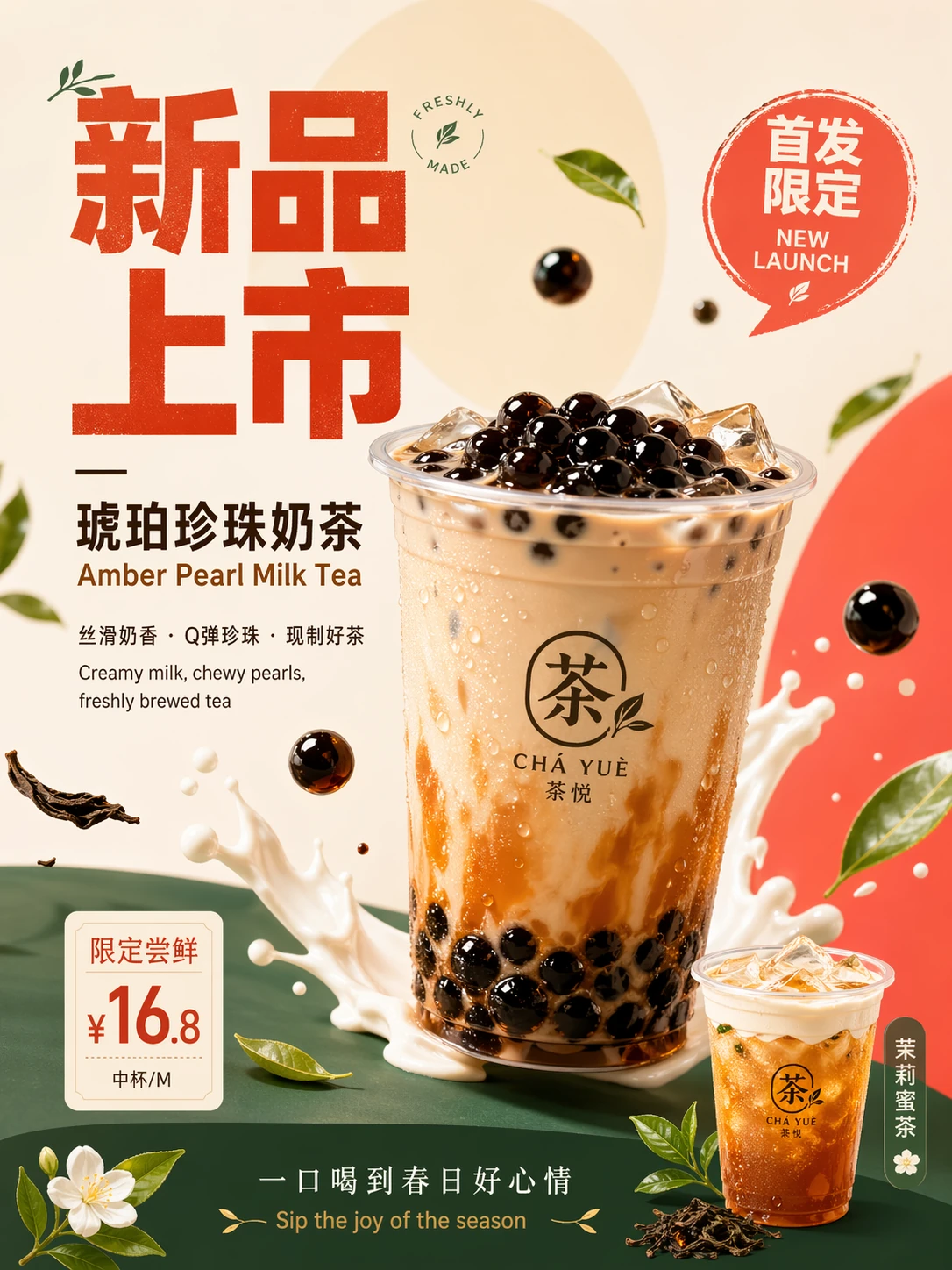 Prompt: Design a 3:4 vertical poster for a new Chinese bubble tea launch. Modern minimalist style with vibrant colors, appetizing visuals, bold Chinese and English typography.