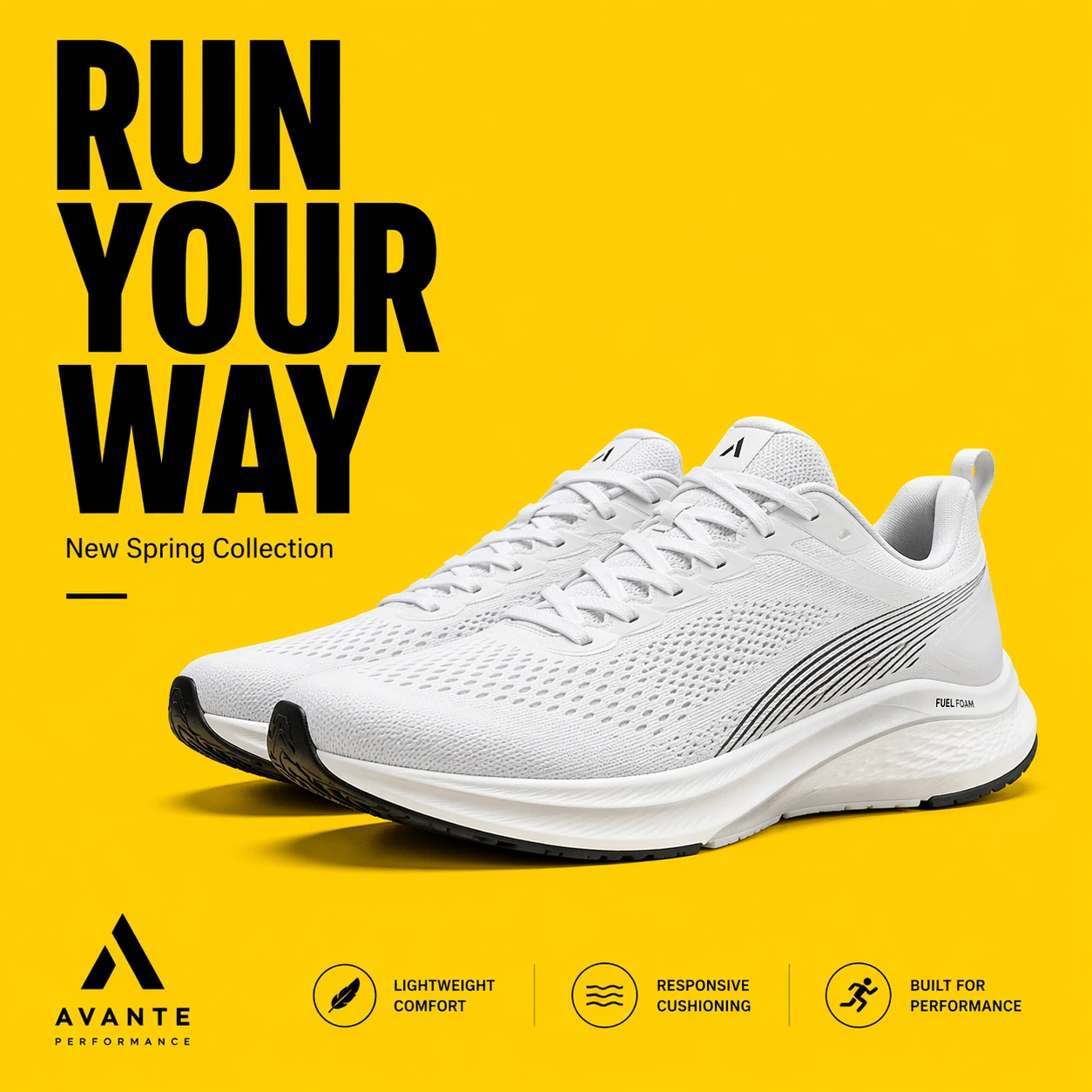 Prompt: Instagram ad creative, 1:1 ratio. A pair of white running shoes on a yellow background with the headline 'RUN YOUR WAY' in bold black type, small subtext 'New Spring Collection' underneath. Clean layout, Swiss design style, high contrast.