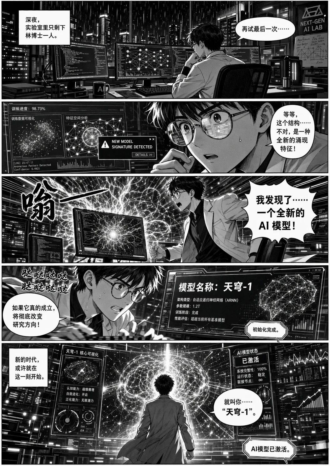 Prompt: Create a vertical 5-panel Chinese manga page about a researcher discovering a new AI model. Black and white manga style, clear speech bubbles with Chinese text, dramatic lighting, consistent character design across all panels.