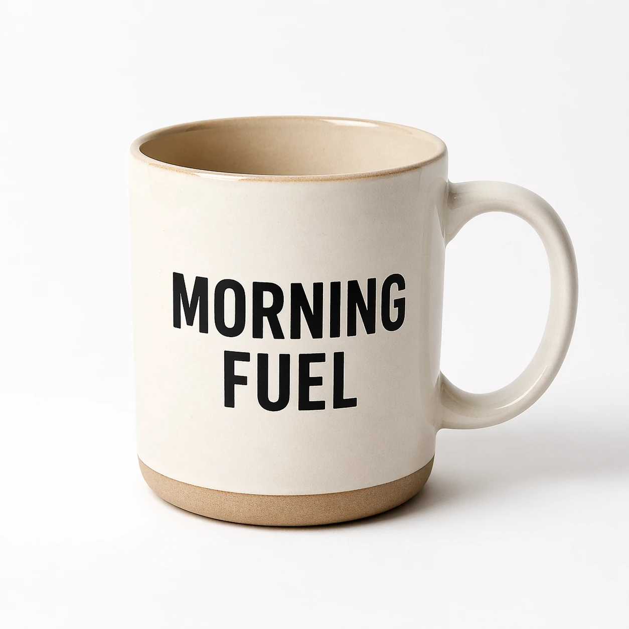 Prompt: E-commerce product shot of a ceramic coffee mug with the text 'MORNING FUEL' rendered on the side in bold sans-serif. White cyclorama background, two-point studio lighting, shallow depth of field, 1:1 ratio.