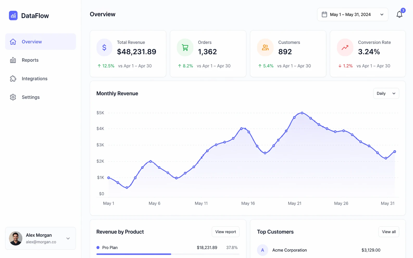 Prompt: A realistic screenshot of a SaaS dashboard for analytics, showing a sidebar with menu items 'Overview', 'Reports', 'Integrations', 'Settings', a main panel with the title 'Monthly Revenue' and a clean line chart below. Light theme, clean sans-serif typography, 1440×900 aspect.